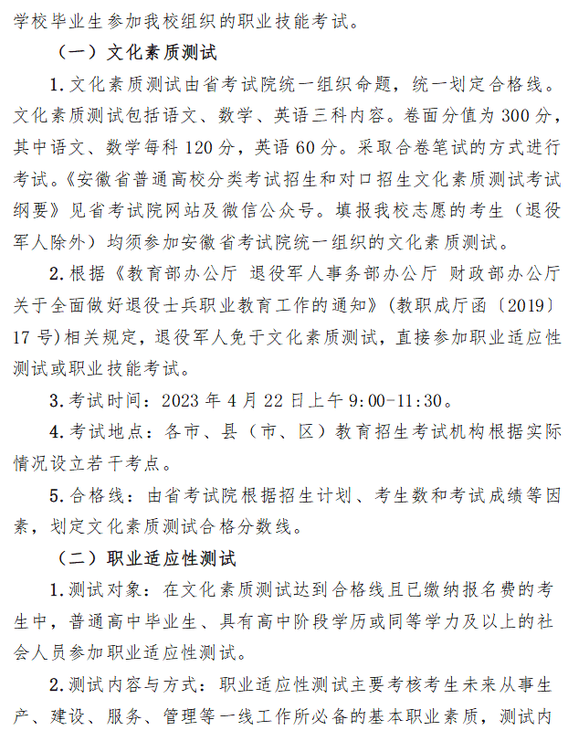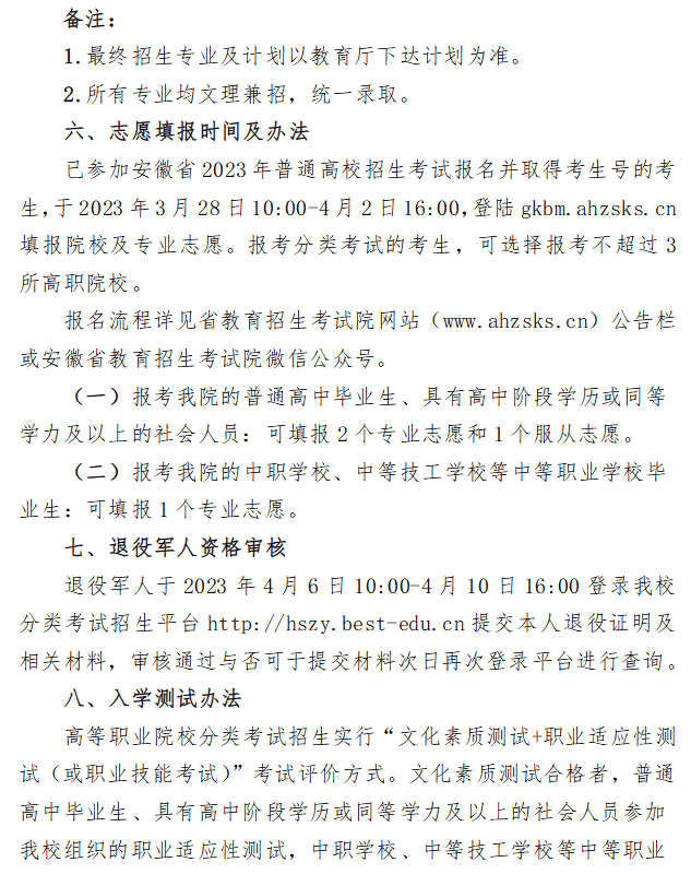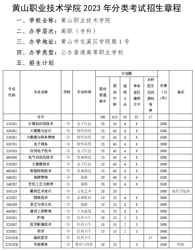 黄山职业技术学院2023年分类考试招生章程